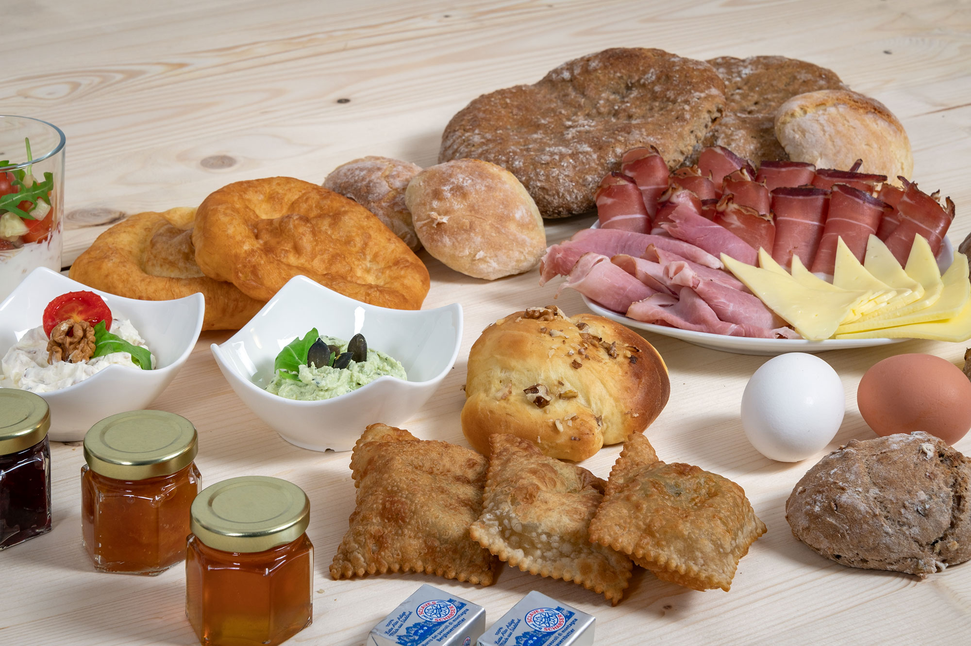 Mit selbstgebackenem Brot, hausgemachten Krapfen, hofeigenem Honig und Marmelade, eigene Kreationen von Aufstrich und Frischkäse, Speck und Wurst vom heimischen Metzger, Butter und Joghurt vom Milchhof Brixen - Brimi, mit hausgemachtem pikantem Müsli.